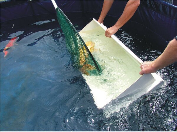 This can cause damage to your Koi, especially the larger ones. Once in the net, near the surface, gently steer the Koi – in the net – towards the bowl or sock-net. Never try to push or drag the Koi I the net as this can cause the fins to get trapped and damaged. Hold the bowl deep in the water and gently steer the Koi over the top of the bowl, and then let it swim into the bowl.