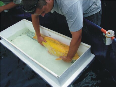 Kurt does this on his own using his arm to hold the Koi while injecting with the other hand at the back of the dorsal fin.