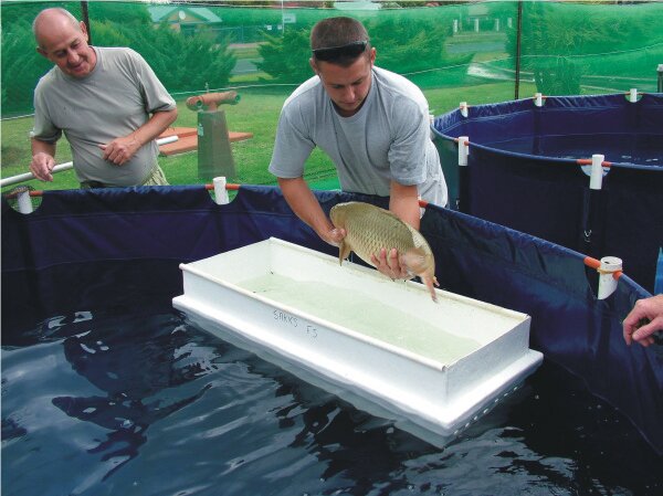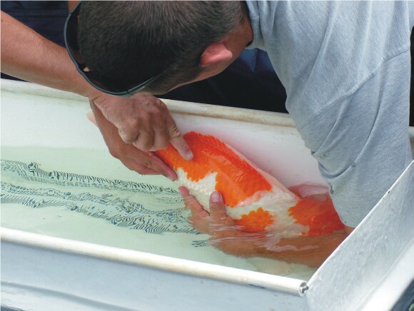 This way Kurt can feel when the Koi is going to move and not rip the flesh with the syringe needle. Perhaps the most spectacular handling is the carrying of big Koi. This is done by holding the head with one hand, pointing it towards your own stomach. Then, with the other hand, support the body by holding the Koi at the centre of the underside. This hand should be up against the abdominal or pelvic fins.
