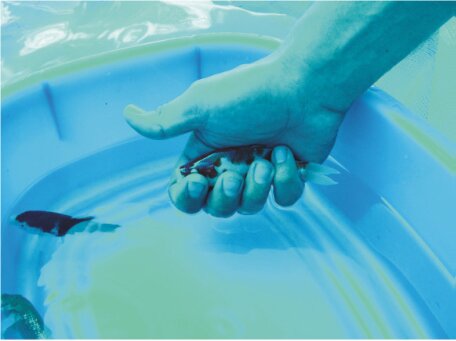 Small Koi (less than 12 cm) are best handled with one hand. Have the head towards the thumb, hold the side of the head with the index finger and if necessary, the thumb can hold the nose.