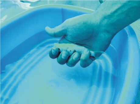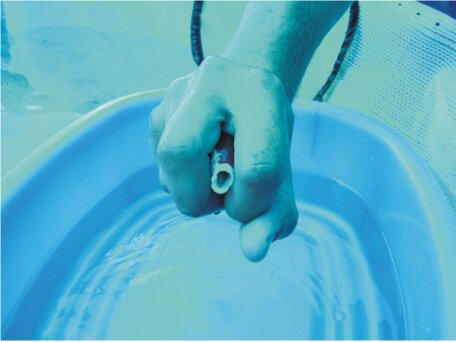 Alternatively take the Koi from the net using the sock net. Catch the Koi in the sock net head first. He can then be lifted and carried to a bowl. Always use a good quality sock net as some types of sock net can strip the mucus layer from the Koi. Some hobbyists use a plastic bag instead of a sock net.  Once in the bowl the Koi can be handled. Before handling a Koi remove your watch and jewellery from your hands and wrist to prevent injury to the Koi. You should not leave the Koi alone in the bowl but if you do get called away for a minute, cover the bowl with the net in case the Koi jumps. The water in the bowl can heat up quickly so never leave a Koi alone for more than one minute, it can run out of oxygen very quickly, If you are going to be away from the Koi for more than one minute, release it back into the pond until you are ready to work with is again. The water in the bowl should not be too deep. It should just cover the Koi as they need a good volume of water to pick up speed to jump.
