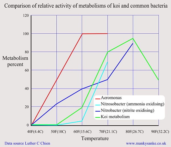 The graph below demonstrates the rapid increase bacterial activity as temperatures rise and then the slow catch-up of the koi metabolism (immune system). Added to this our filter bacteria activity also takes time to get going again after winter.